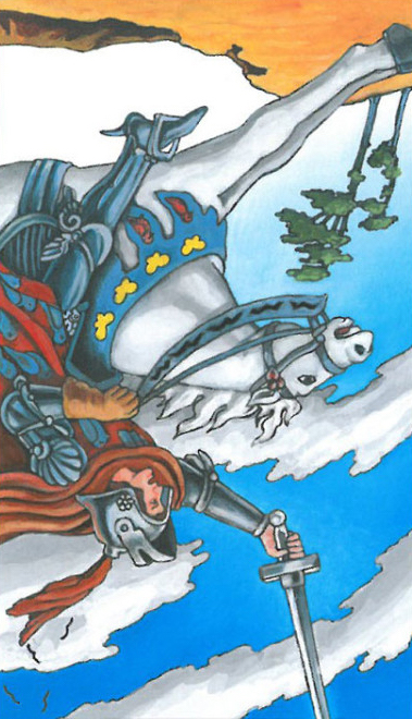 牌面描述:疾风掠过的旷野,宝剑骑士身披利落战甲,手握一柄锋芒柔化却藏锐志的剑,策马疾驰,衣袂与剑穗同疾风共舞。他目光如炬望向远方,无半分迟疑,剑刃划破风的阻碍,似带着破局的果敢与思辨的锐进——不是盲目的狂奔,是带着清晰目标的迅捷奔赴,风的灵动与剑的锐度相融,是敢闯敢破、快思快行的骑士模样。