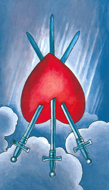 牌面描述:三柄光洁的剑刃轻抵柔瓣,无分毫锋锐的戾气,只像心底漫开的轻阵痛。晨露凝在剑脊,如未坠的清泪,软云漫过剑穗的绒絮,脚下的浅草轻承这份微澜,天地都静成温柔的接纳,等阵痛慢慢散作清风,落向泥土的柔软里。