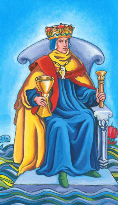 牌面描述:国王端坐于水畔雕花石座,身披暗纹鎏金披风,掌心轻托盛满清泓的圣杯,水流绕指如沉静的絮语。周身是漫向天际的墨色水泽,眸光藏着深海般的睿智与担当,马蹄莲绕座而生,每一寸姿态都带着稳实的笃定,空气里漫着温润的水汽,万物皆在这份沉稳的守护里安然归位。