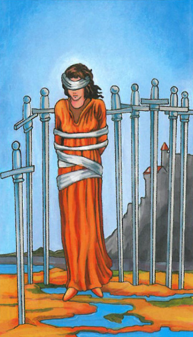 牌面描述:雾色轻笼的林间空地,八柄柔化锋芒的剑错落围合,似轻织的网而非冷硬的禁锢。蒙眼的纱轻垂于肩头,无半分逼仄,草木绕剑而生,风拂剑脊漾起细碎的光,天地间只余心的轻响,像一场温柔的内观,等一场自我解绑的清醒。