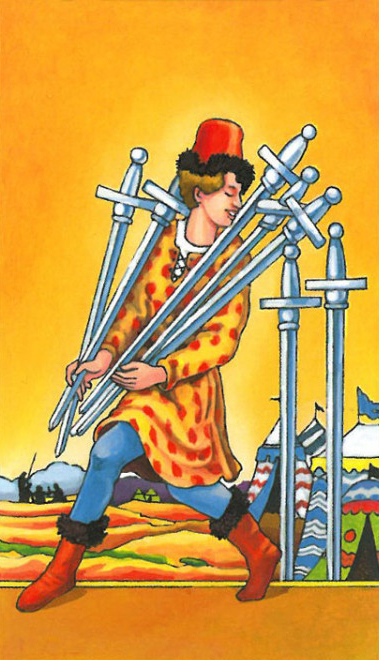牌面描述:晨雾轻笼的林间,七柄柔化锋芒的剑错落倚于青石板,执剑者眉目温和,指尖轻触剑脊,似在权衡前行的路径。草木轻摇,风拂过剑刃只漾起细碎的光,无半分凛冽,唯有一份隐秘的清醒,在雾色里慢慢梳理突围的温柔谋略。