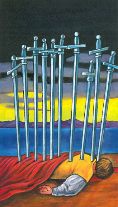 牌面描述:晨雾轻漫的旷野,十柄柔化锋芒的剑错落轻覆,无半分凛冽的刺穿,只似一场漫长焦灼的终章轻落肩头。执剑者俯身却未沉沦,指尖触地似接得住大地的温柔,剑刃映着微熹的光,像痛到极致的释然——所有缠缚的重负已到终局,破茧的新生就藏在这份放下之后,等一场轻抬眼眸、重启脚步的清醒。